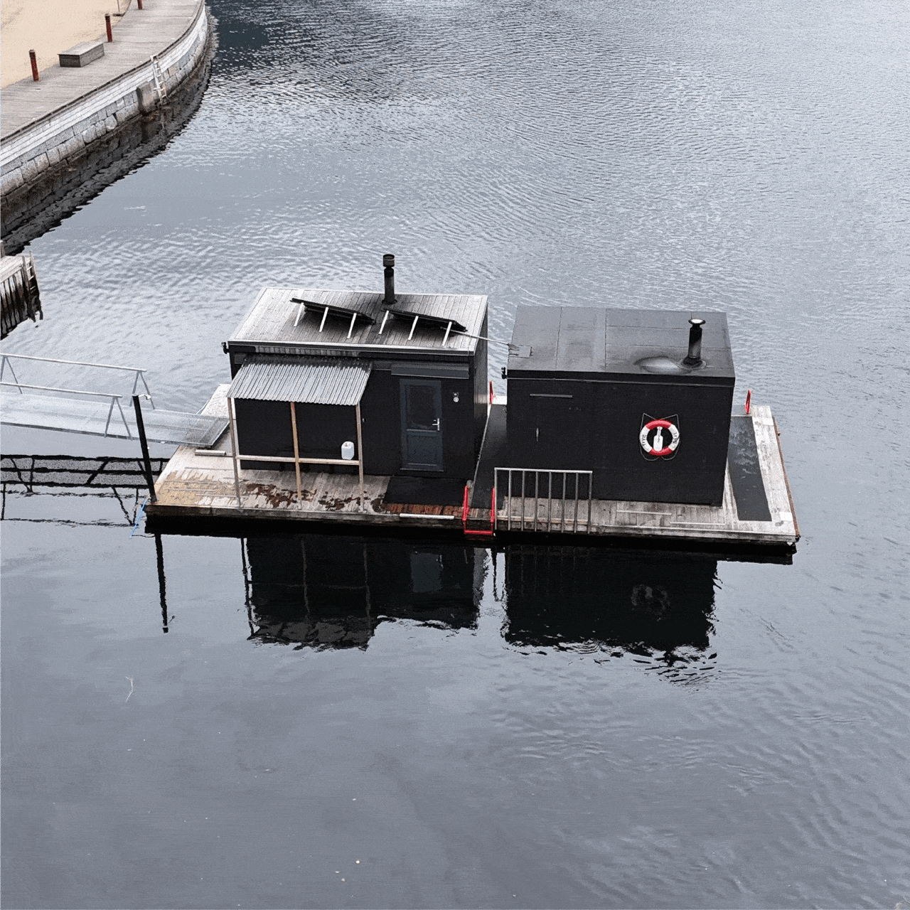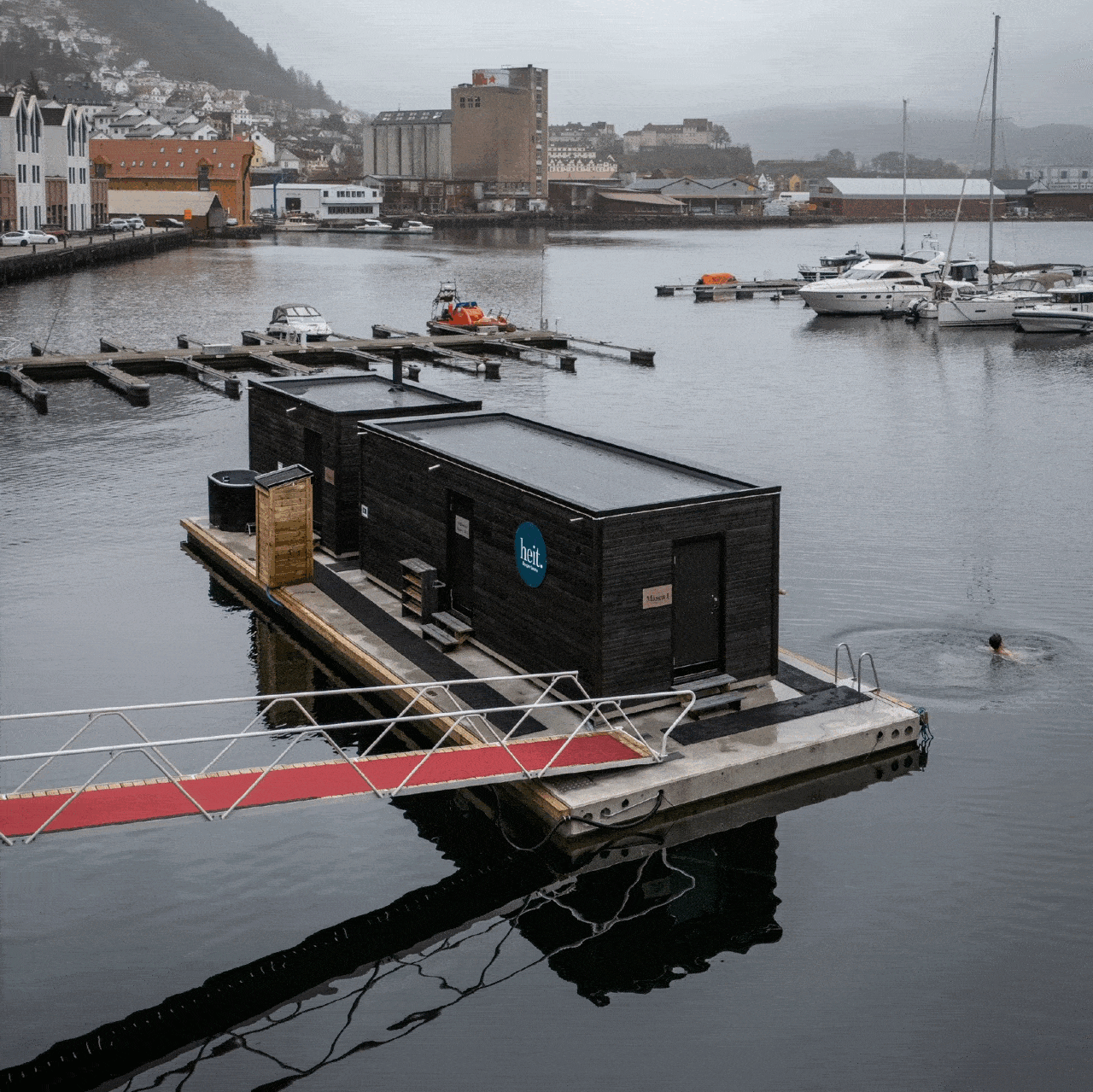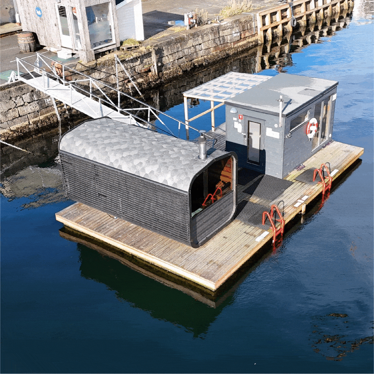 Våre nyeste flytende saunaer på måseskjæret i Sandviken. Her er alt man trenger for en urban saunaopplevelsse i kultuhistoriske omgivelser og utsikt mot Byfjorden. Vi har 3 spesialdesignede sanaer, med 3 badestiger, 2 utedusjer med varmt vann og jacuzzi med kaldt fersk rent vann. Store gode unisex skifterom med egne avlukker. Har du bagasje kan man sette dette fra seg på land på kontoret til badstueverten. Parkering like ved eller i parkeringshus ved Extra mot avgift. Selvbetjent på morgen hverdager frem til kl 10:00 etter dette tar vår badstuevert i mot deg på kaien. Ta med hengelås hvis du vil låse skapet i felles skifterom. Toaletter inne ved vårt kontor.